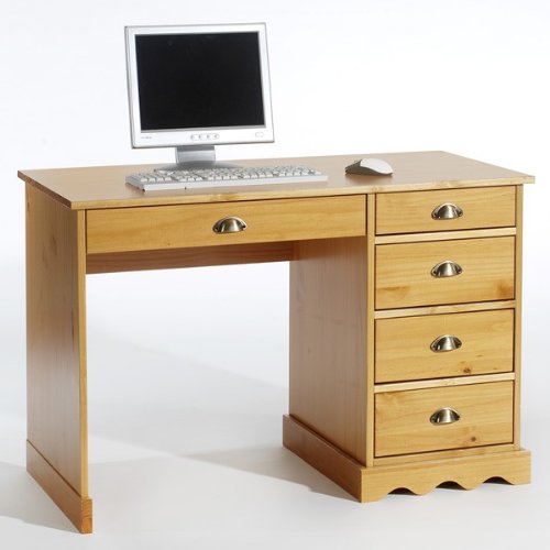 Bureau en pin massif, lasuré couleur miel; Vernis écologiques et non-polluants; 5 tiroirs pour ranger tous les accessoires de bureau; Poignées coquillage en métal