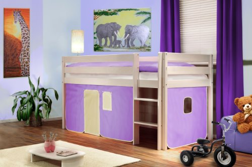 LOFT BED CHILDREN'S BED CURTAIN PURPLE/BEIGE PINE WOOD WHITE