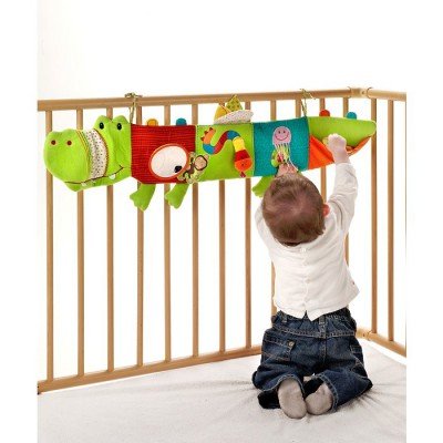 Contour de parc - Théophile Retrouvez Théophile, il est prêt à vous faire découvrir de nombreuses activités. A accrocher au parc ou à votre lit, ce contour d'activités saura vous occuper. Bruit de froissement, miroir, hochet... En tissu. Longueur : 95 x 15 cm.