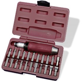 En boîte de mat. synthétique, pour débloquer vis et ecrous, rouillés ou grippés contenu: 1 tournevis à percussion à carré 1/2, anneau de changement de sens droite/gauche 1 douille de réduction pour recevoir les lames 4 lames pour vis à fente 6 8 10 12 mm 4 lames Phillips no 1 2 3 4 4 lames Torx T30 T40 T45 T50 1 embout adaptateur 3/8